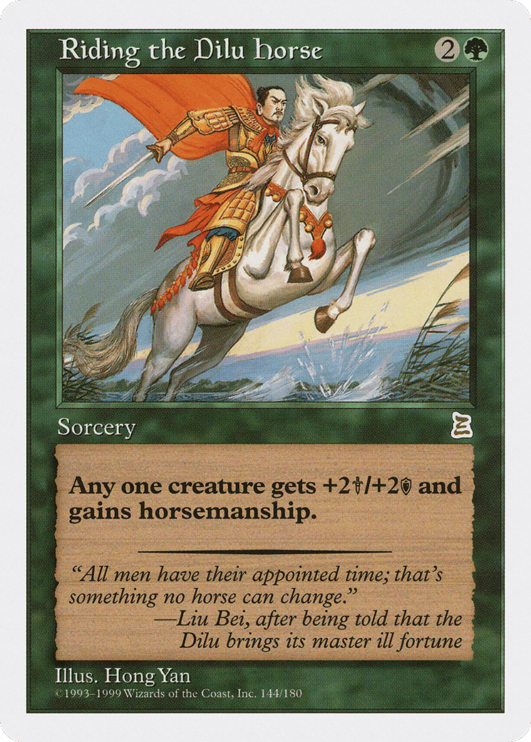 Target creature gets +2/+2 and gains horsemanship. (It can’t be blocked except by creatures with horsemanship. This effect lasts indefinitely.)