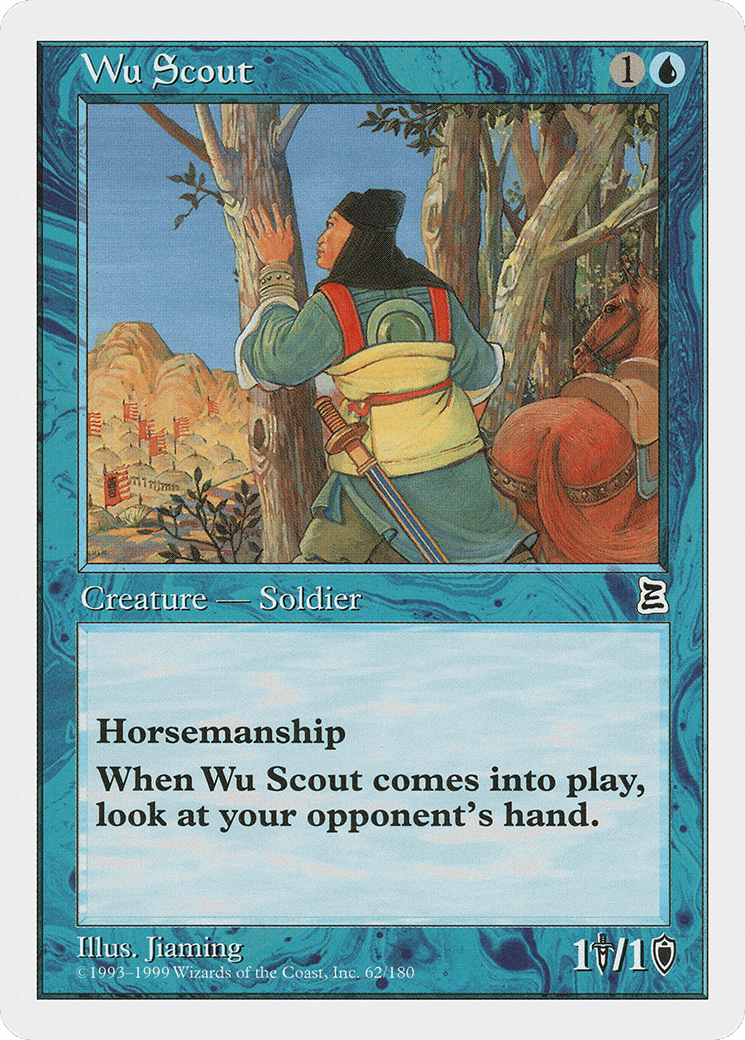 Horsemanship (This creature can’t be blocked except by creatures with horsemanship.) When this creature enters, look at target opponent’s hand.