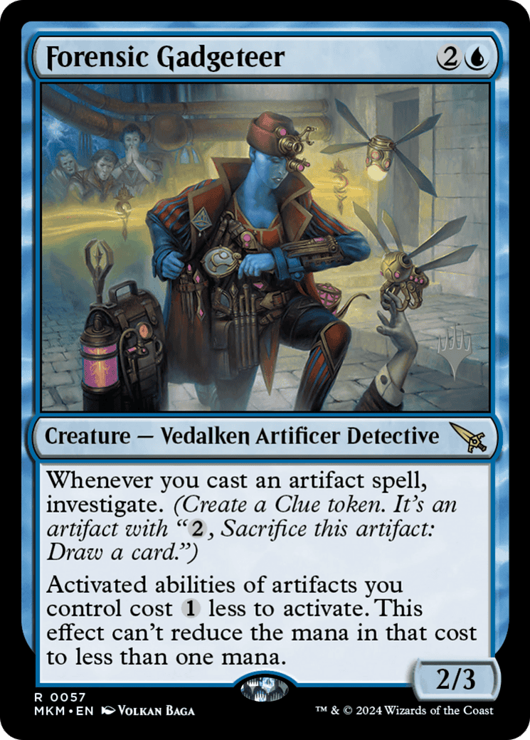 Whenever you cast an artifact spell, investigate. (Create a Clue token. It’s an artifact with “{2}, Sacrifice this token: Draw a card.”)