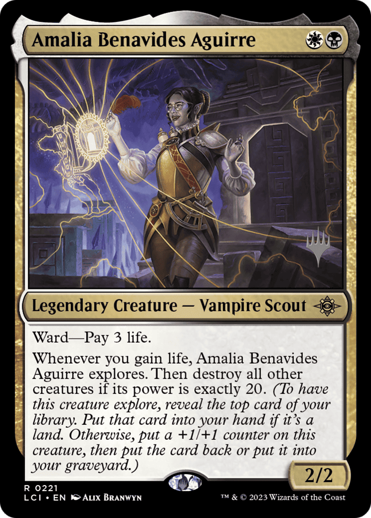 Whenever you gain life, Amalia Benavides Aguirre explores. Then destroy all other creatures if its power is exactly 20. (To have this creature explore, reveal the top card of your library. Put that card into your hand if it’s a land. Othe