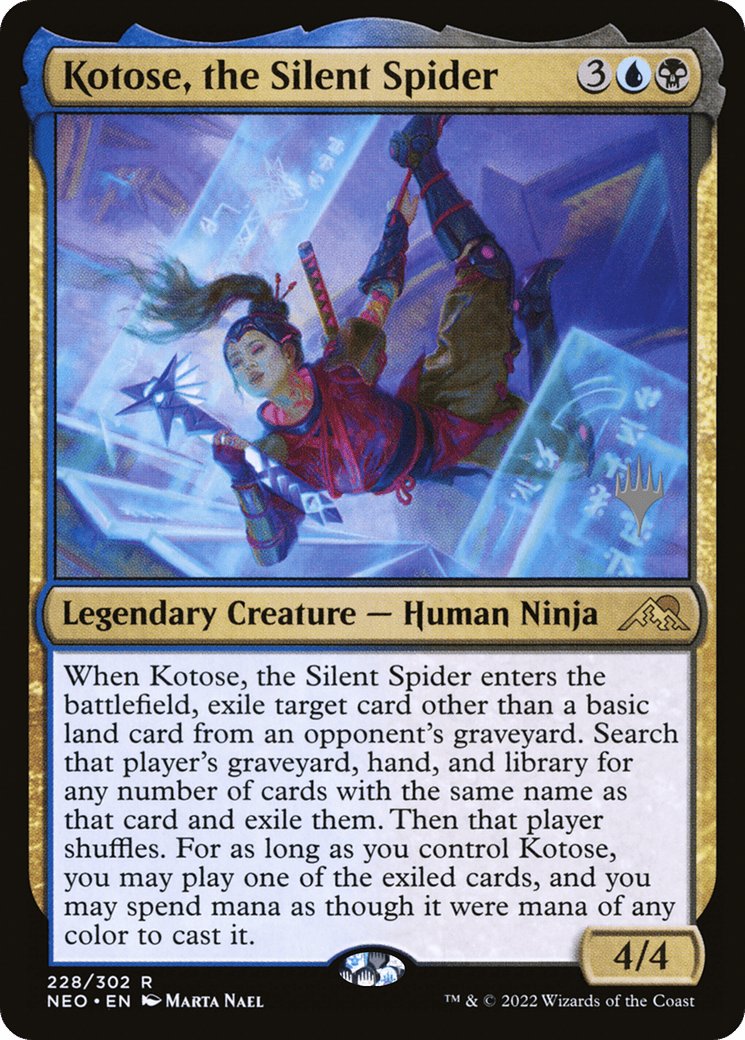 When Kotose enters, exile target card other than a basic land card from an opponent’s graveyard. Search that player’s graveyard, hand, and library for any number of cards with the same name as that card and exile them. Then that player shuffles. For as lo