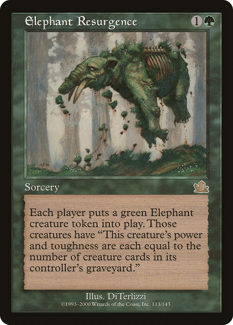 Each player creates a green Elephant creature token. Those creatures have “This token’s power and toughness are each equal to the number of creature cards in its controller’s graveyard.”