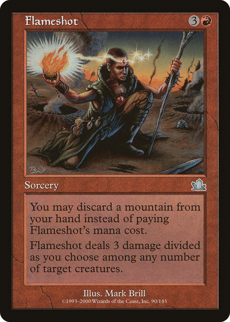 You may discard a Mountain card rather than pay this spell’s mana cost. Flameshot deals 3 damage divided as you choose among one, two, or three target creatures.