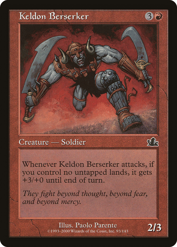 Whenever this creature attacks, if you control no untapped lands, it gets +3/+0 until end of turn.