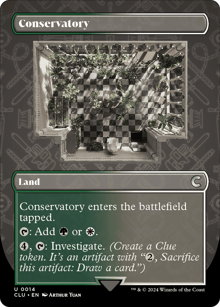 This land enters tapped. {T}: Add {G} or {W}. {4}, {T}: Investigate. (Create a Clue token. It’s an artifact with “{2}, Sacrifice this token: Draw a card.”)