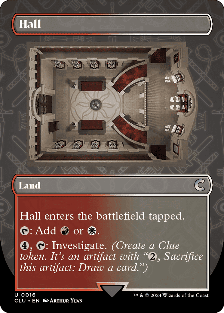 This land enters tapped. {T}: Add {R} or {W}. {4}, {T}: Investigate. (Create a Clue token. It’s an artifact with “{2}, Sacrifice this token: Draw a card.”)