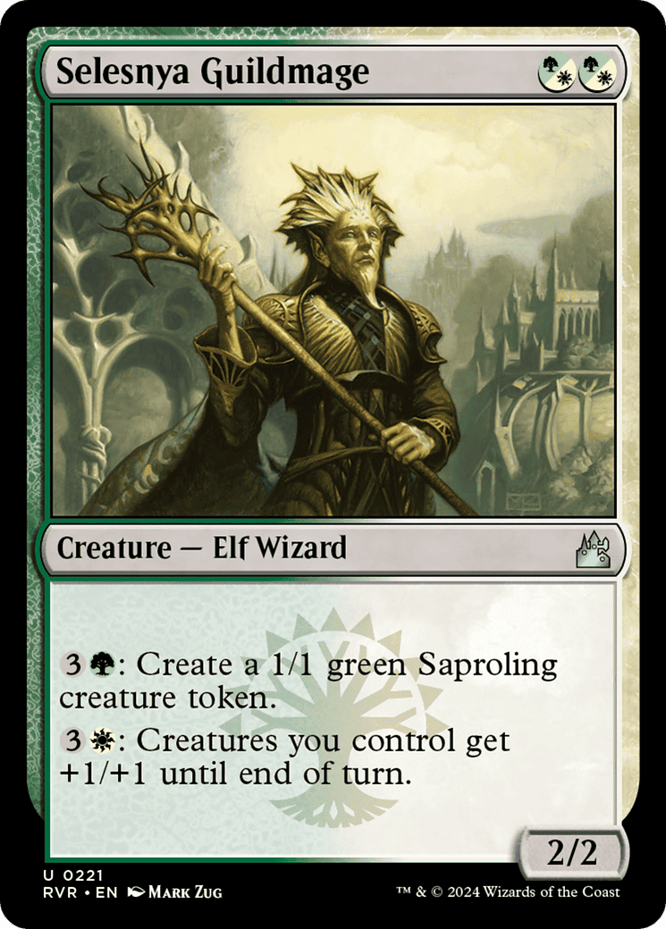 {3}{G}: Create a 1/1 green Saproling creature token. {3}{W}: Creatures you control get +1/+1 until end of turn.
