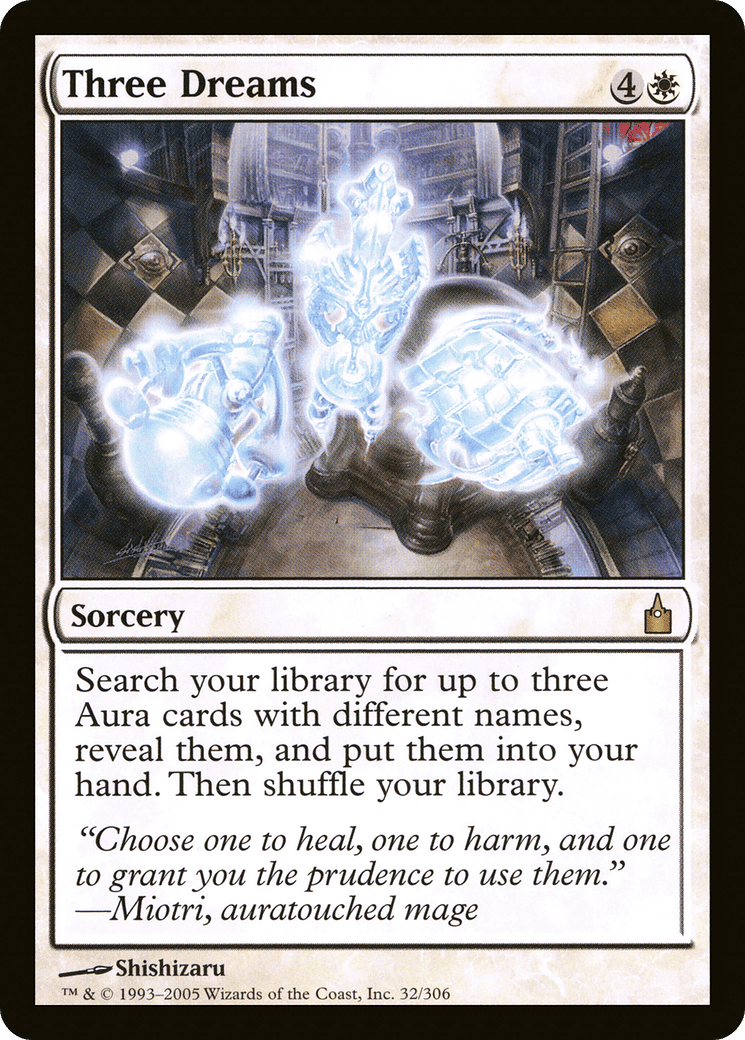 Search your library for up to three Aura cards with different names, reveal them, put them into your hand, then shuffle.