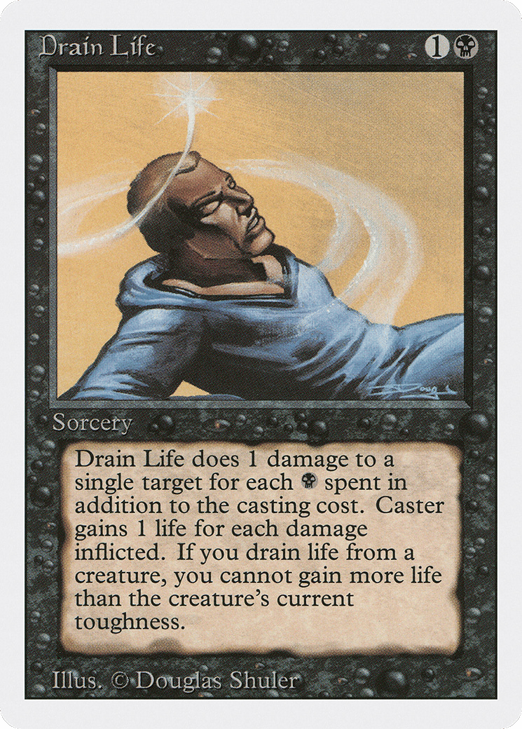 Drain Life deals X damage to any target. You gain life equal to the damage dealt, but not more life than the player’s life total before the damage was dealt, the planeswalker’s loyalty before the damage was dealt, or the creatu