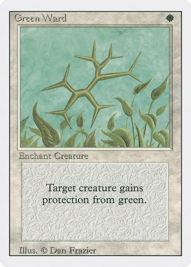 Enchant creature Enchanted creature has protection from green. This effect doesn’t remove this Aura.