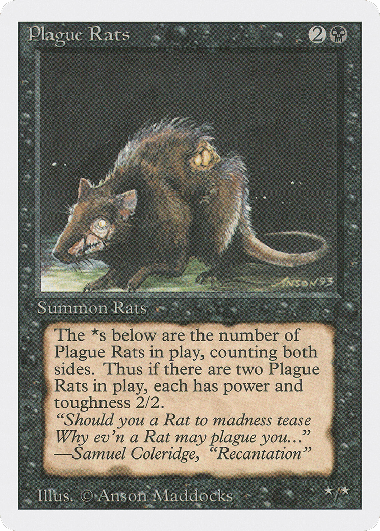 Plague Rats’s power and toughness are each equal to the number of creatures named Plague Rats on the battlefield.
