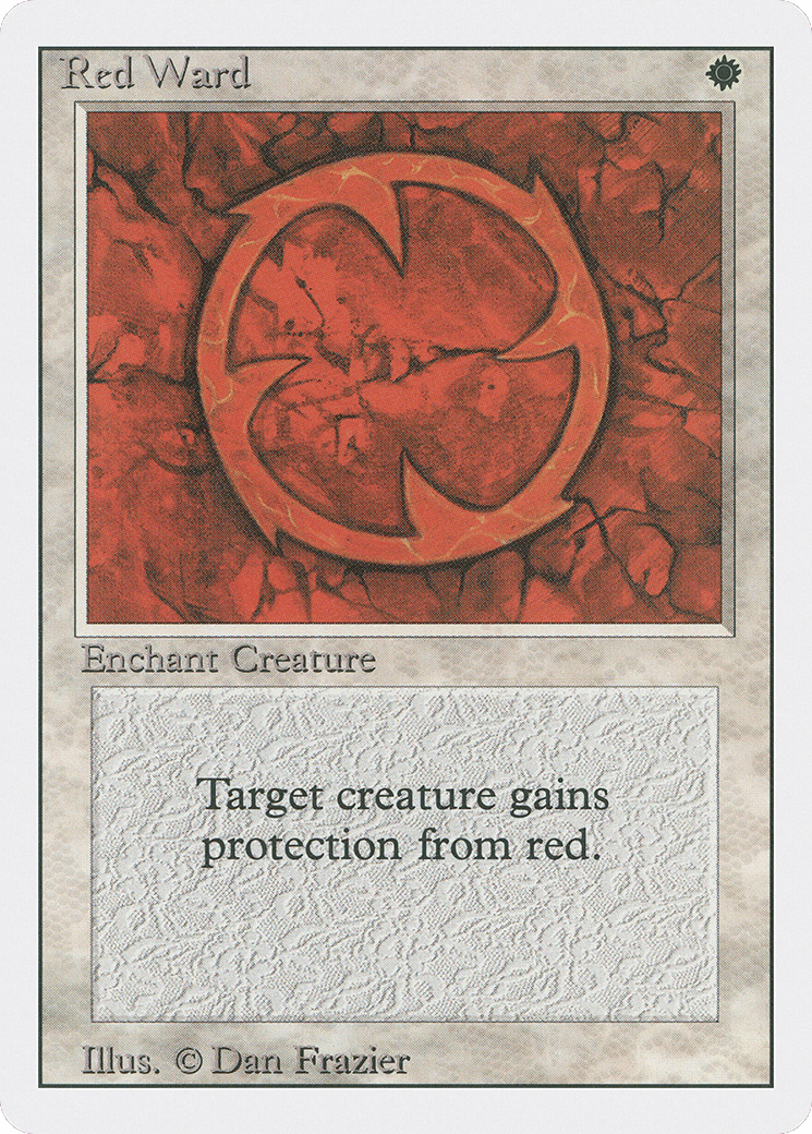 Enchanted creature has protection from red. This effect doesn’t remove this Aura.