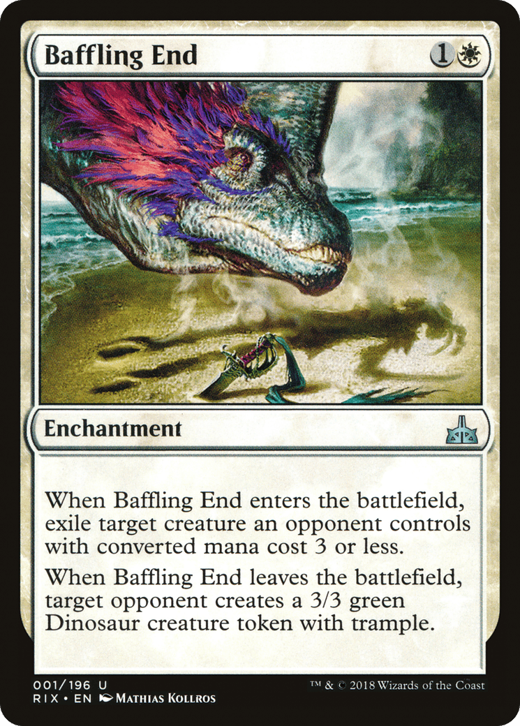 When this enchantment leaves the battlefield, target opponent creates a 3/3 green Dinosaur creature token with trample.