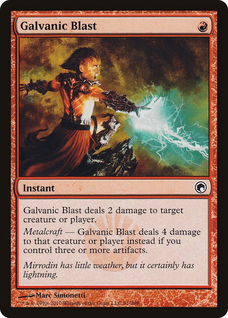 Metalcraft – Galvanic Blast deals 4 damage instead if you control three or more artifacts.