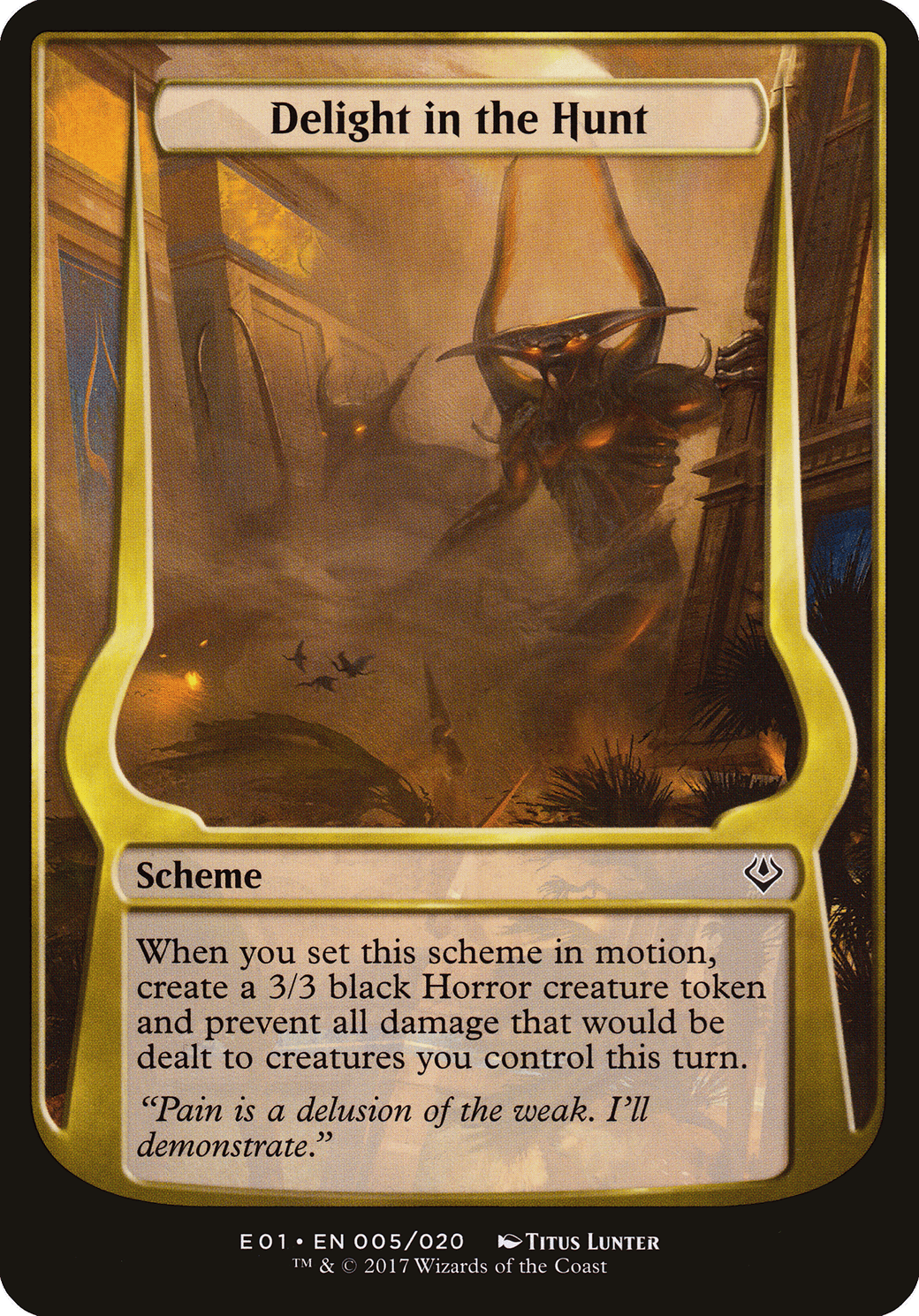When you set this scheme in motion, create a 3/3 black Horror creature token and prevent all damage that would be dealt to creatures you control this turn.