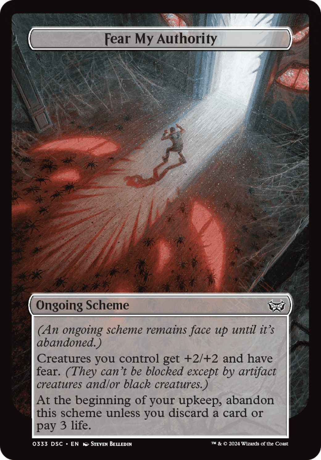 Creatures you control get +2/+2 and have fear. (They can’t be blocked except by artifact creatures and/or black creatures.)