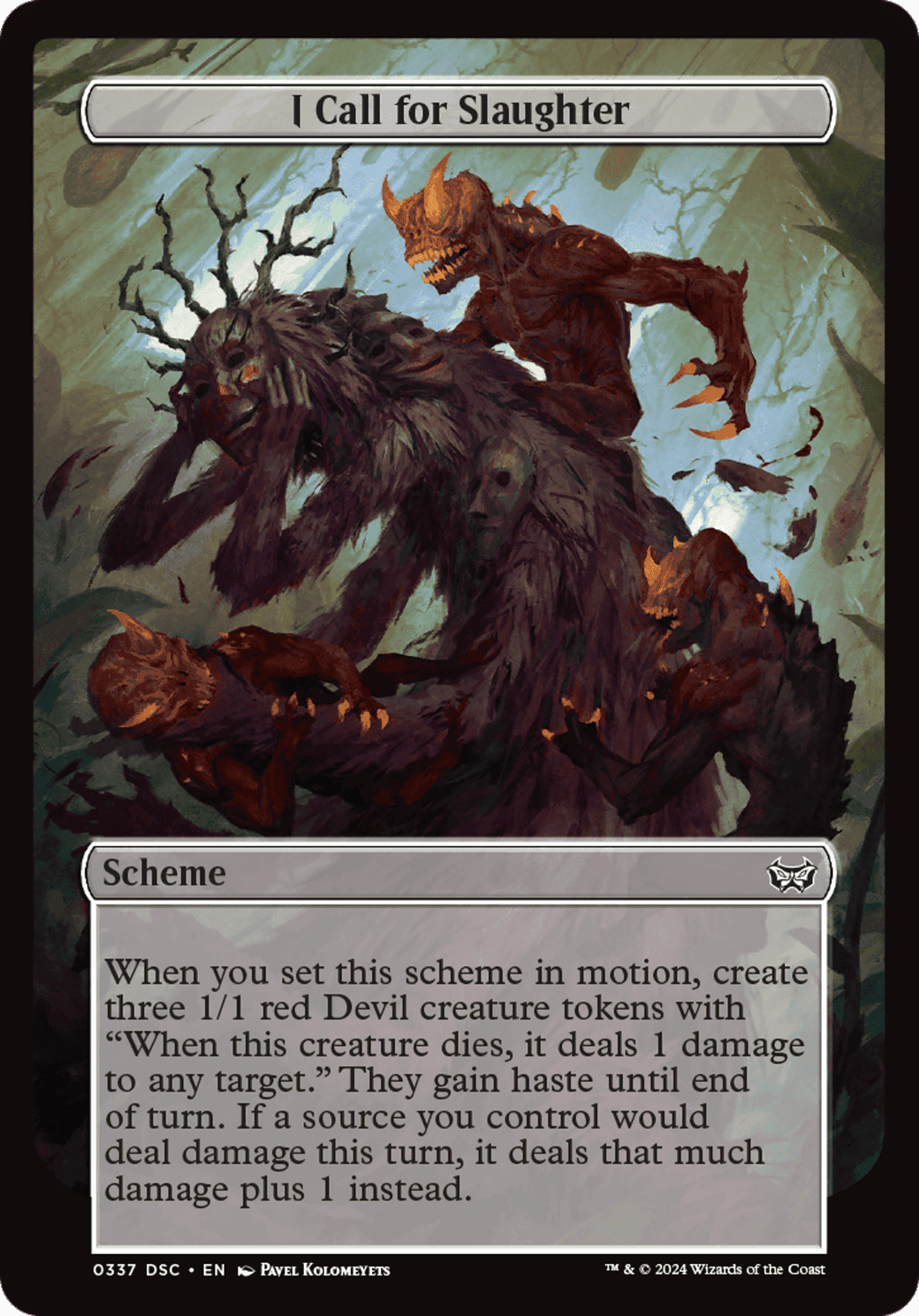 When you set this scheme in motion, create three 1/1 red Devil creature tokens with “When this token dies, it deals 1 damage to any target.” They gain haste until end of turn. If a source you control would deal damage this turn, it deals that much damage