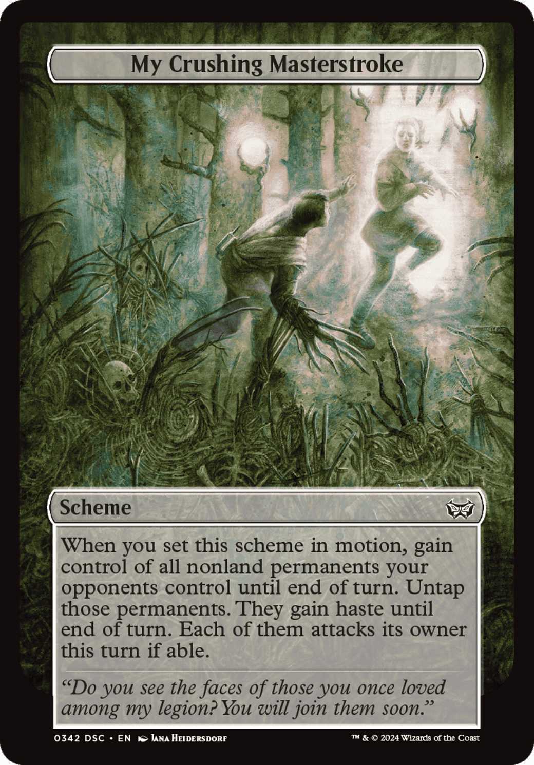 When you set this scheme in motion, gain control of all nonland permanents your opponents control until end of turn. Untap those permanents. They gain haste until end of turn. Each of them attacks its owner this turn if able.