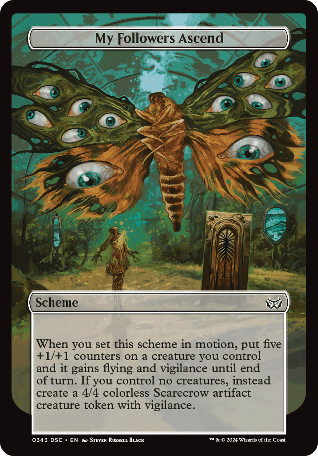 When you set this scheme in motion, put five +1/+1 counters on a creature you control and it gains flying and vigilance until end of turn. If you control no creatures, instead create a 4/4 colorless Scarecrow artifact creature token with vigilance.