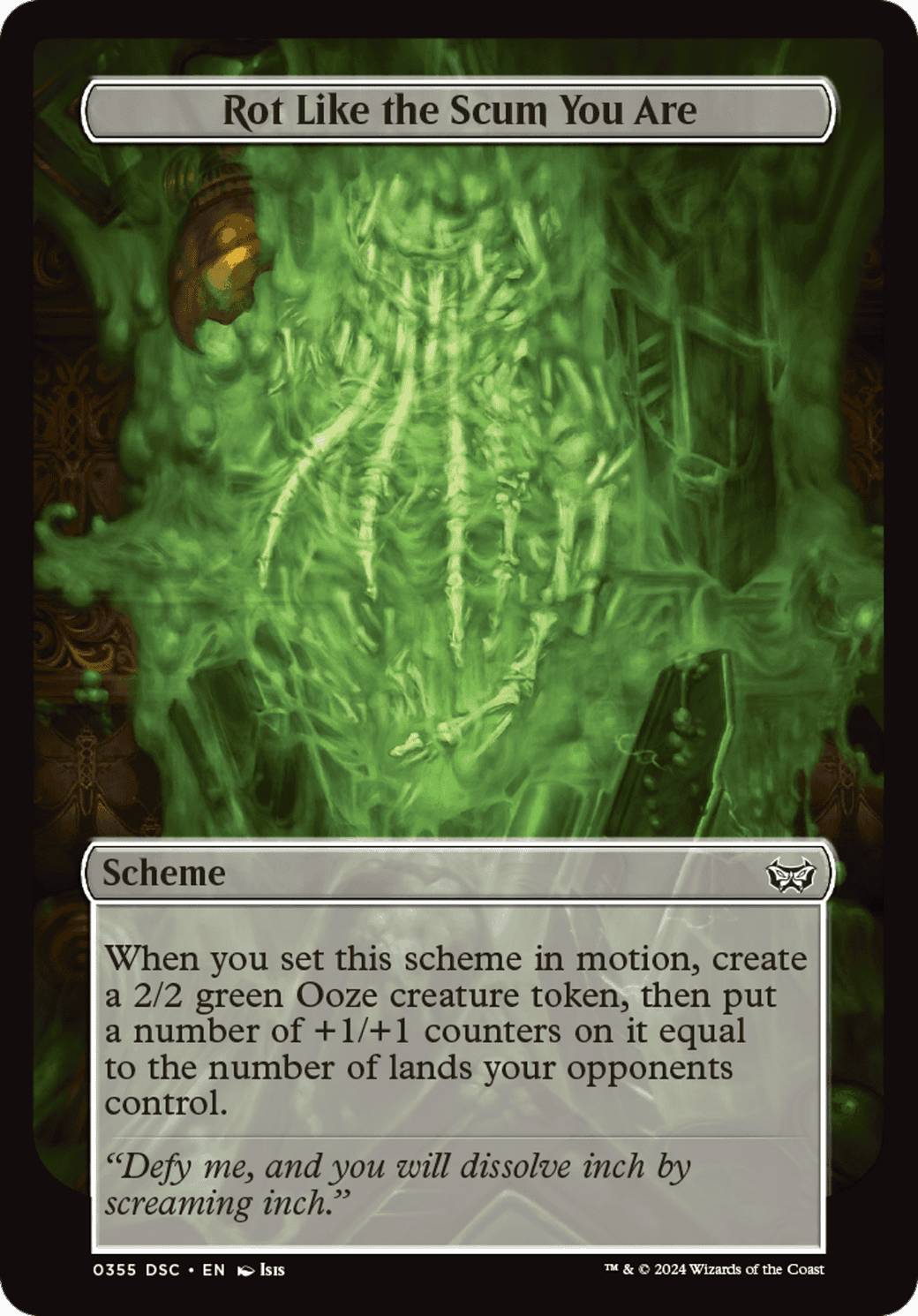 When you set this scheme in motion, create a 2/2 green Ooze creature token, then put a number of +1/+1 counters on it equal to the number of lands your opponents control.
