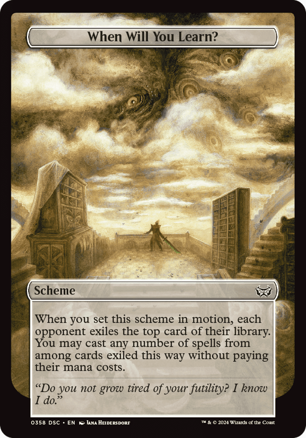 When you set this scheme in motion, each opponent exiles the top card of their library. You may cast any number of spells from among cards exiled this way without paying their mana costs.