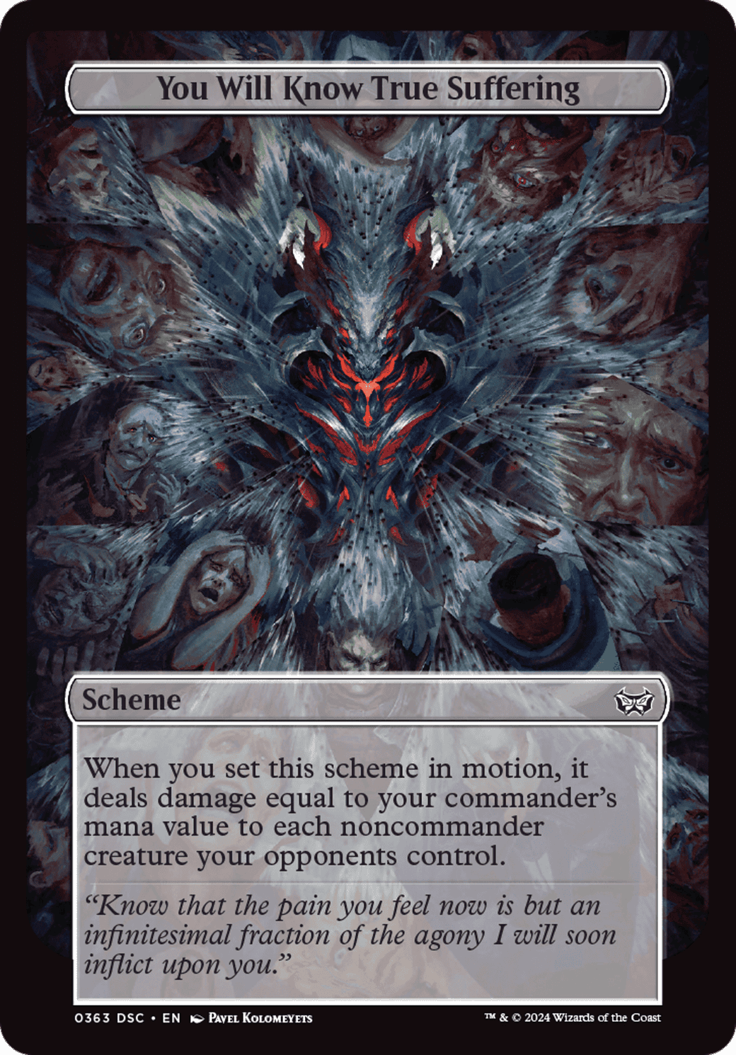 When you set this scheme in motion, it deals damage equal to your commander’s mana value to each noncommander creature your opponents control.