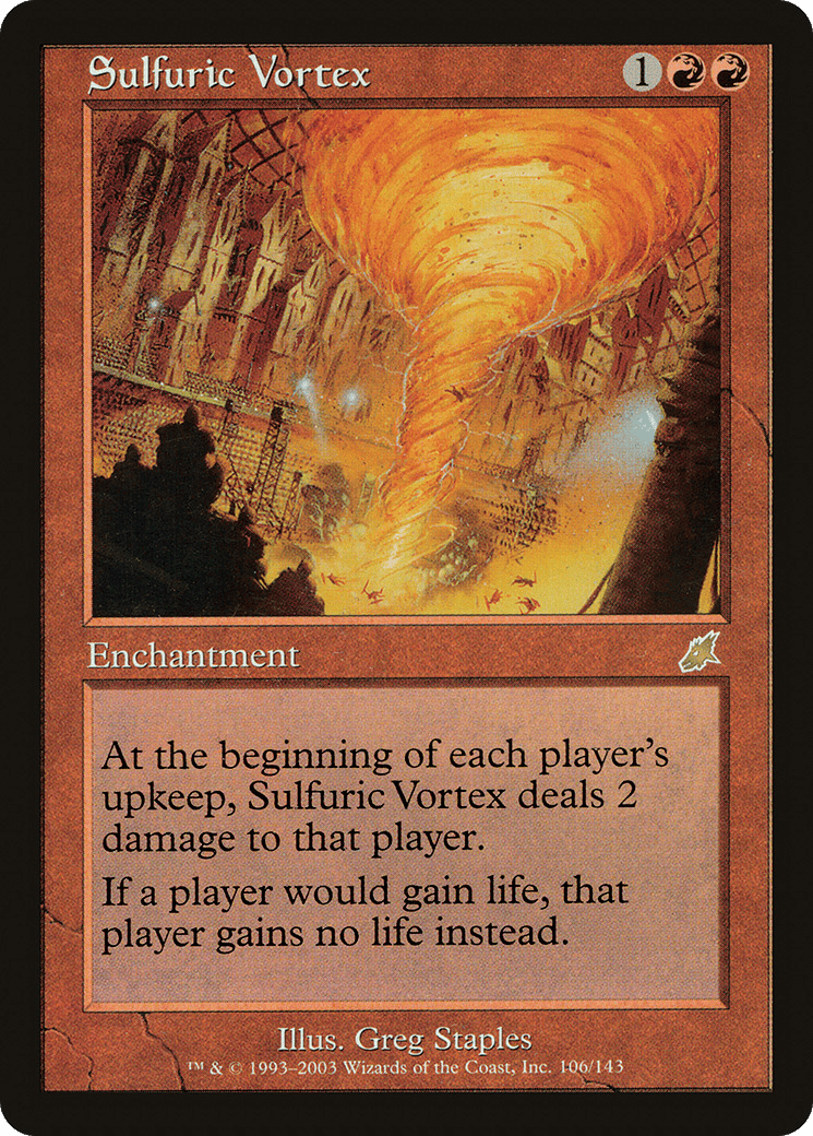At the beginning of each player’s upkeep, this enchantment deals 2 damage to that player. If a player would gain life, that player gains no life instead.
