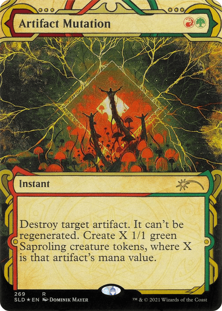 Destroy target artifact. It can’t be regenerated. Create X 1/1 green Saproling creature tokens, where X is that artifact’s mana value.