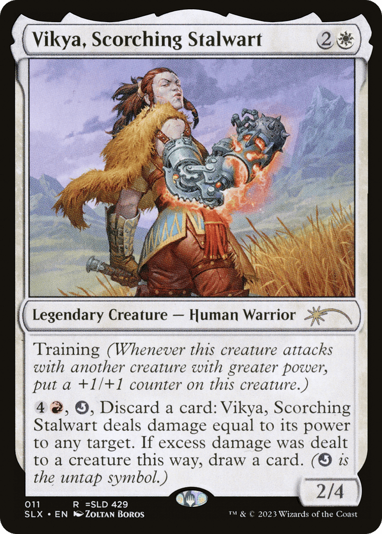 {4}{R}, {Q}, Discard a card: Vikya, Scorching Stalwart deals damage equal to its power to any target. If excess damage was dealt to a
