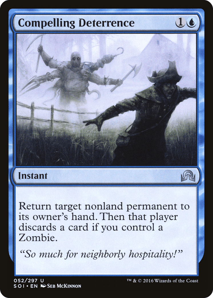 Return target nonland permanent to its owner’s hand. Then that player discards a card if you control a Zombie.