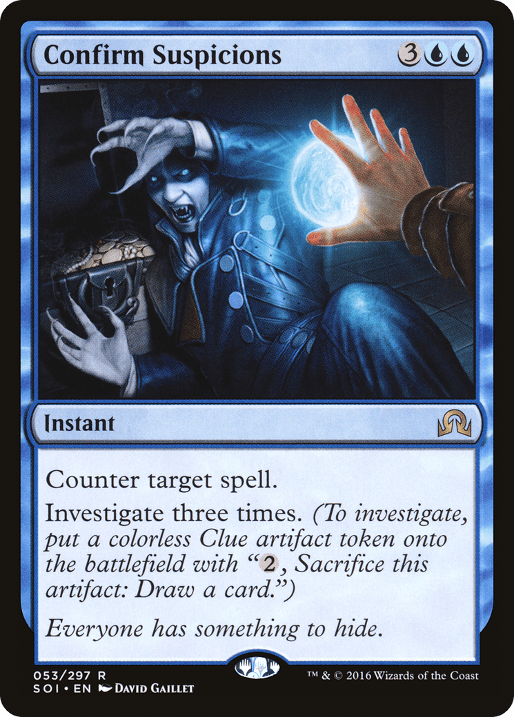 Investigate three times. (To investigate, create a Clue token. It’s an artifact with “{2}, Sacrifice this token: Draw a card.”)