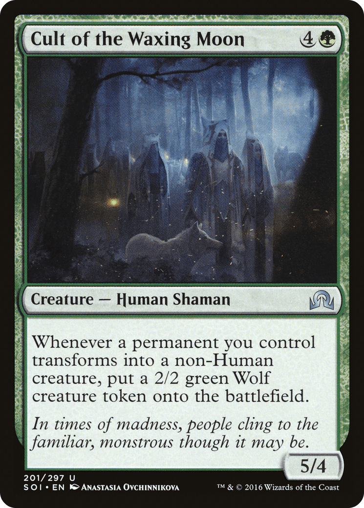 Whenever a permanent you control transforms into a non-Human creature, create a 2/2 green Wolf creature token.