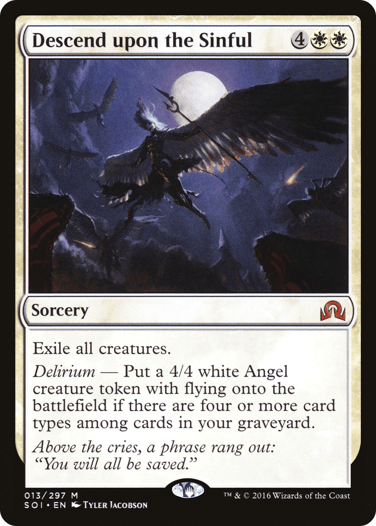 Delirium – Create a 4/4 white Angel creature token with flying if there are four or more card types among cards in your graveyard.