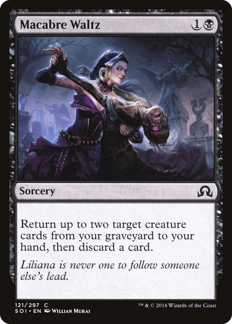 Return up to two target creature cards from your graveyard to your hand, then discard a card.