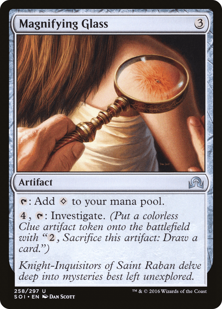 {4}, {T}: Investigate. (Create a Clue token. It’s an artifact with “{2}, Sacrifice this token: Draw a card.”)