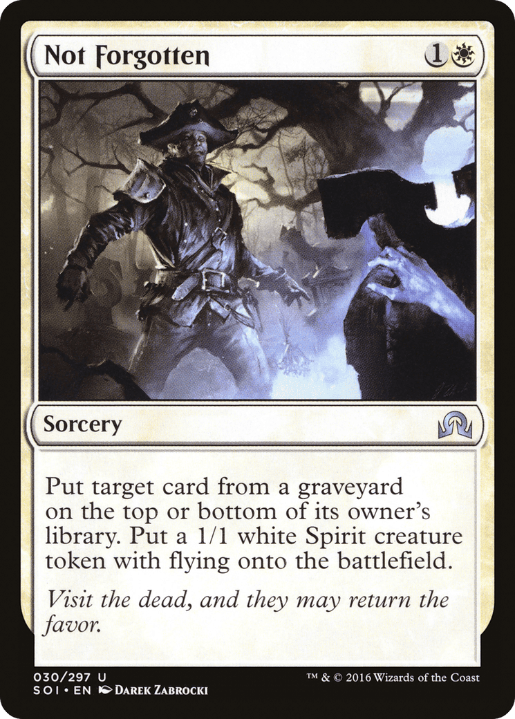 Put target card from a graveyard on your choice of the top or bottom of its owner’s library. Create a 1/1 white Spirit creature token with flying.