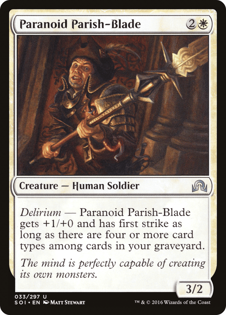 Delirium – This creature gets +1/+0 and has first strike as long as there are four or more card types among cards in your graveyard.