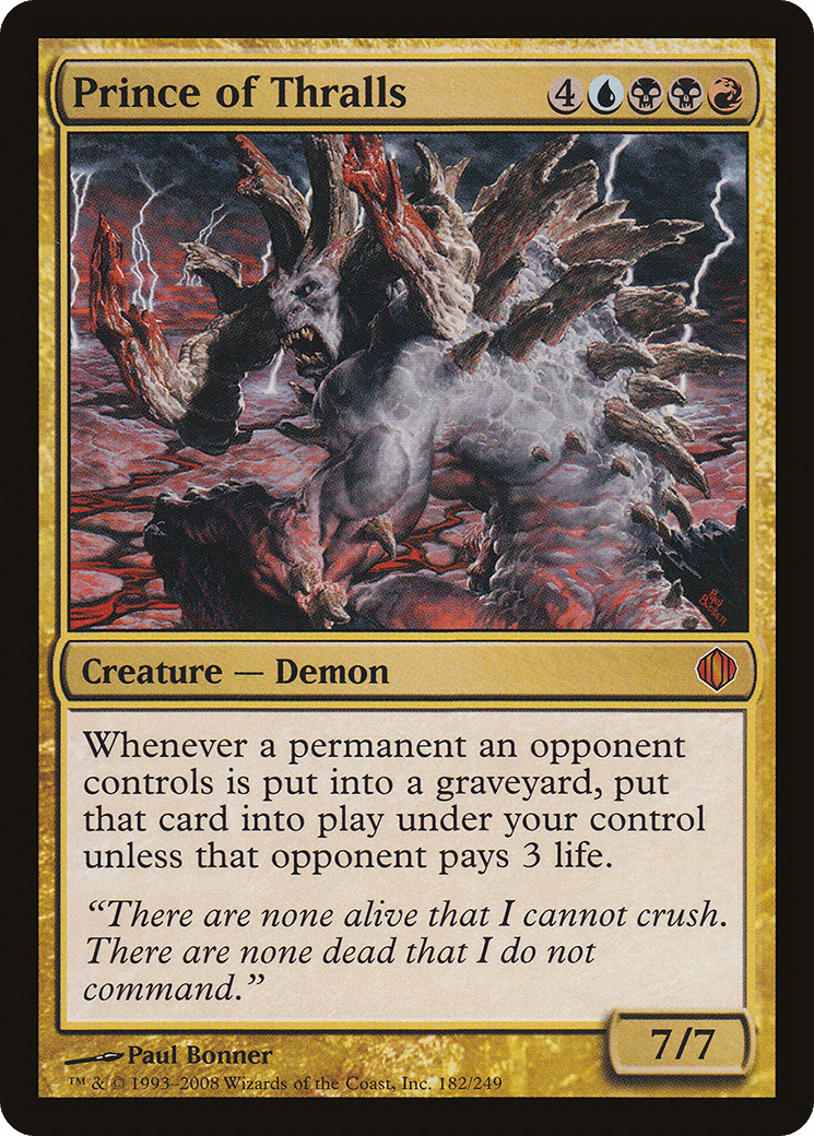 Whenever a permanent an opponent controls is put into a graveyard, put that card onto the battlefield under your control unless that opponent pays 3 life.