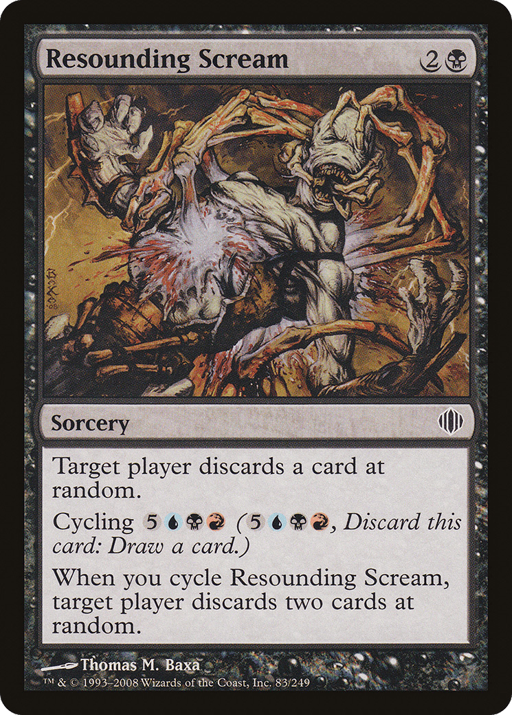 Target player discards a card at random. Cycling {5}{U}{B}{R} ({5}{U}{B}{R}, Discard this card: Draw a card.) When you cycle this card, target player discards two cards at random.