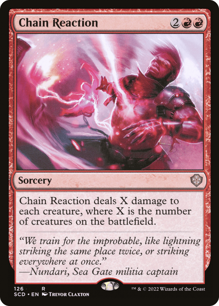 Chain Reaction deals X damage to each creature, where X is the number of creatures on the battlefield.