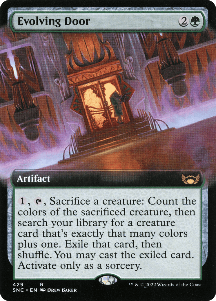 {1}, {T}, Sacrifice a creature: Count the colors of the sacrificed creature, then search your library for a creature card that’s exactly that many colors plus one. Exile that card, then shuffle. You may cast the exiled card. Activate only as a sorcery.
