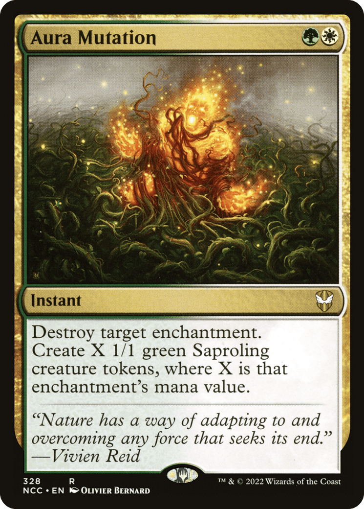 Destroy target enchantment. Create X 1/1 green Saproling creature tokens, where X is that enchantment’s mana value.