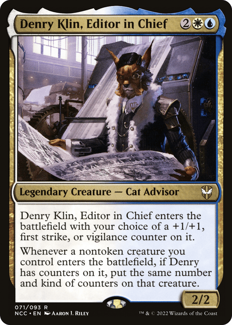Denry Klin enters with your choice of a +1/+1, first strike, or vigilance counter on it.