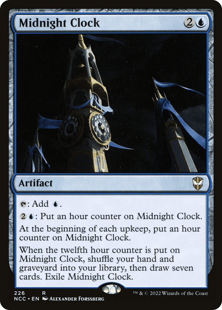 When the twelfth hour counter is put on this artifact, shuffle your hand and graveyard into your library, then draw seven ca