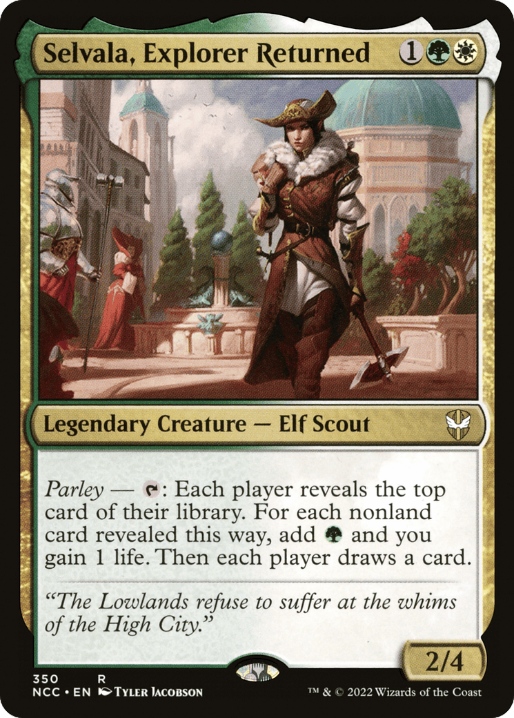 Parley – {T}: Each player reveals the top card of their library. For each nonland card revealed this way, add {G} and you gain 1 life. Then each player draws a card.
