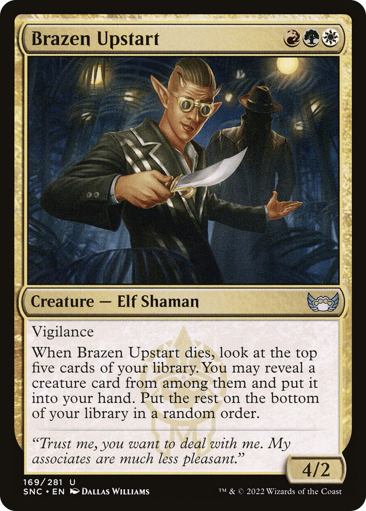 When this creature dies, look at the top five cards of your library. You may reveal a creature card from among them and put it into your hand. Put the rest on the bottom of your library in a random order.