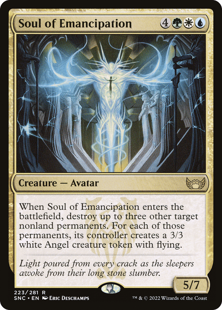 When this creature enters, destroy up to three other target nonland permanents. For each of those permanents, its controller creates a 3/3 white Angel creature token with flying.