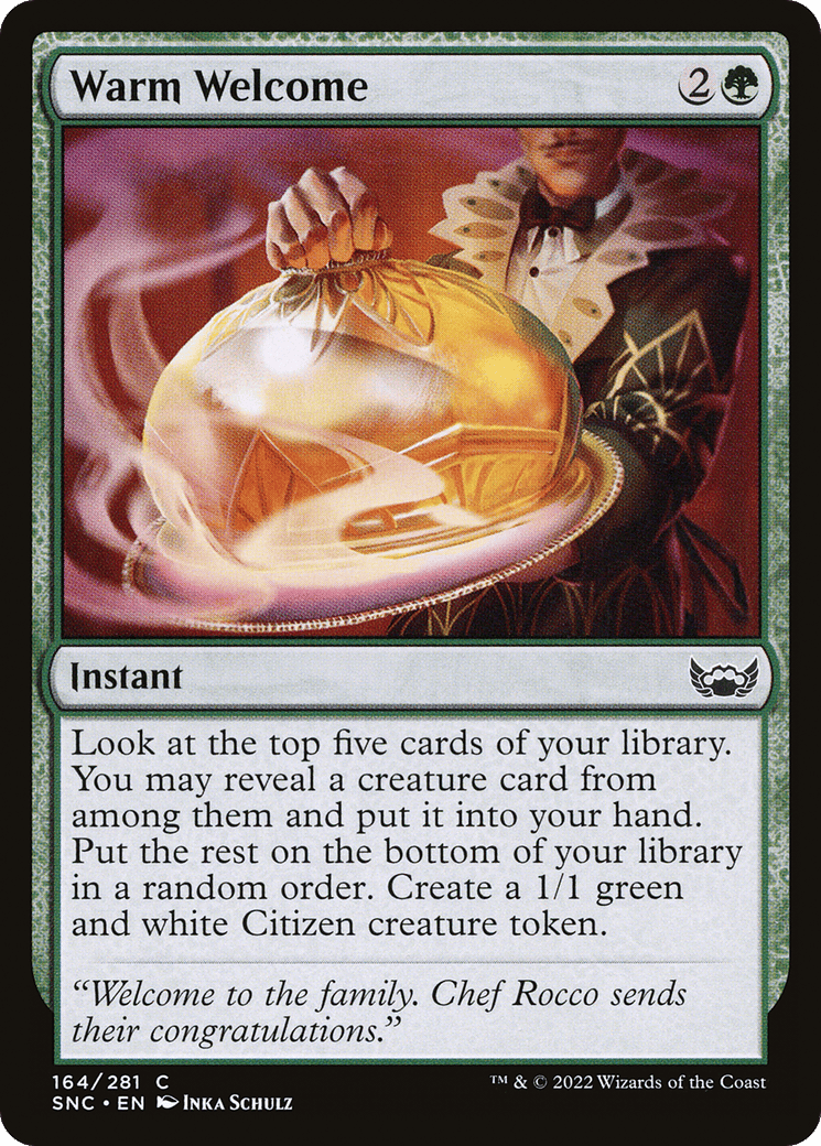 Look at the top five cards of your library. You may reveal a creature card from among them and put it into your hand. Put the rest on the bottom of your library in a random order. Create a 1/1 green and white Citizen creature token.