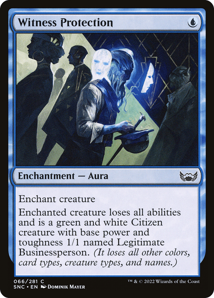 Enchanted creature loses all abilities and is a green and white Citizen creature with base power and toughness 1/1 named Legitimate Businessperson. (It loses all other colors, card types, creature types, and names.)