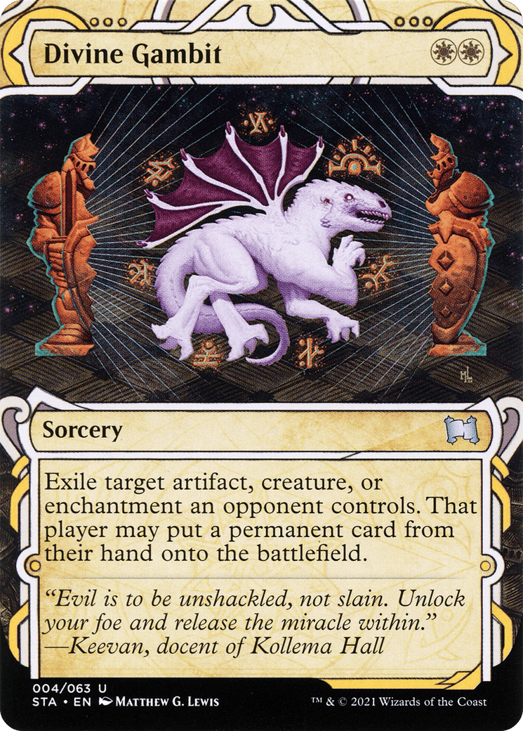 Exile target artifact, creature, or enchantment an opponent controls. That player may put a permanent card from their hand onto the battlefield.